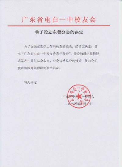 广东省电白一中校友会经广东省社会组织管理局批准,于2013年9月15日正式成立。本会的住所为广东省广州市天河北路567号17D座。